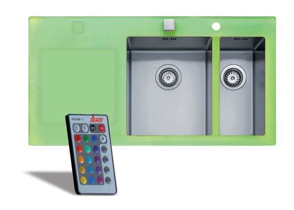 כיור אלקטרוני הכולל משטחי חימום בצידיו לייבוש מהיר של כלים ולוח בקרה המאפשר לווסת את זרם המים והטמפרטורה, כולל שלט. "Teka"