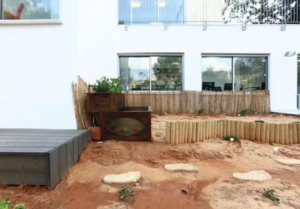 מרחב הגינה החובר אל הוואדי, הוא מעין שטח ניסויי ללא השקיה מלאכותית. בשטחו נשתלו סוקולנטים וצמחים שונים שקורי עוקב אחרי צמיחתם, בסמוך למרזבים נשתלו קני במבוק, ואלמנט מיוחד כאן היא יחידה שמורכבת מאקווריום בו משייטים להם בנחת דגי נוי, ומאדנית עליונה בה שתולים צמחי תבלין. קורי: "זוהי מערכת בפיתוח ישראלי שיוצרת מארג ביולוגי סגור ללא צורך בהשקיה. הצמחים נהנים מדישון טבעי (שהדגים מייצרים ולכן אין צורך בשימוש בדשנים סינטטיים) והדגים, בתמורה, נהנים ממים מטוהרים בעזרת הטוף והצמחייה, כך שבעצם זהו מיקרוקוסמוס קטן בדומה למה שקורה בטבע בנחלים.