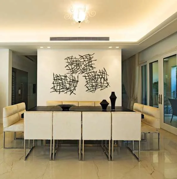 פינת האוכל, שמאחוריה מוצנע המטבח: שולחן גדול עם משטח עור קרוקו שחור וכיסאות המשלבים בסיס מתכת מודרני וריפוד קטיפה מבריק.