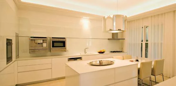 מטבח מעוצבבהתאם לבקשת בעלת הבית המטבח המרווח מוצנע מאחורי קיר החוצץ בינו לבין המטבח, כשמשני עבריו ישנם פתחי מעבר מרווחים אליו. אמנם מוצנע, אך אינו סוטה מהרוח האלגנטית שמאפיינת את אזורי האירוח- כמותם הוא נהנה מפתחים גדולים המקיימים דיאלוג עם הגן, וחזותו אפילו "סלונית" משהו. הוא עוצב כחלל בהיר ונוח מאד, עתיר שטחי אחסון ומשטחי עבודה, ובמרכז חללו ניצבת יחידת אי שקצה אחד שלה נמוך יותר ומשמש כשולחן אוכל "רגיל". בהיקף החלל המרווח תוכננו יחידות שונות לצרכים מגוונים: יחידת קיר המאכלסת, בין היתר, מכשירי חשמל בצד אחד, יחידת אחסון נמוכה וארוכה כעין שידה בצד אחר, ורצף של יחידות תחתונות הזורם "מקיר לקיר" עם משטח עליון בו משתלבים כיור ומשטח עבודה. הקיר מעליו חופה בזכוכית, כאשר חלק ממנו עובה מעט לצורך שילוב אינטגראלי של אביזרי חשמל מתקדמים שחזותם המעוצבת תורמת ערך אסתטי נוסף לחלל כולו.