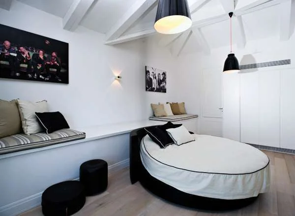 חדרו של הבן, מאידך, הוא חלל מודרני, וחגיגה לכל נער מתבגר. תכנונו ניצל את גג הרעפים ליצירת חצי מפלס נוסף, כך ששטחו נחלק לאזור לימודים-אירוח במפלס אחד הכולל גם מרפסת הצופה לגינה האחורית, ואזור שינה-רחצה בגלריה עליונה שגם בה קבוע פתח גדול מחדיר אור. תקרת החלל היא תקרת עץ משופעת שנצבעה בלבן, צבעוניותו המאופקת נרקמת מגווני שחור, לבן עם נגיעות של חום ואפור, ועיצובו כולל פתרונות לאילוצים מבניים, דוגמת קורה קונסטרוקטיבית שהוצנעה מאחורי מדף המשמש כגב למיטה העגולה שמייצגת "טוויסט" צעיר ועכשווי.