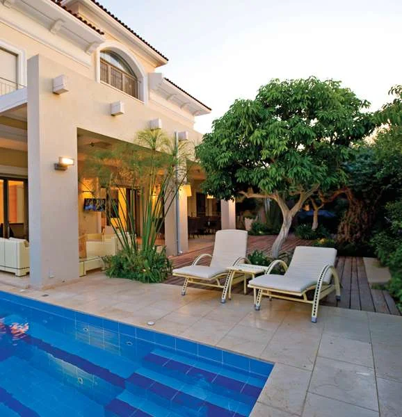 הגינה כמתחם מזמין ומפנק: פינות ישיבה ואוכל ברחבה מרוצפת מקורה בפרגולה בנויה, ריצוף דק משובץ בצמחייה מטופחת ובריכת שחייה ארוכה .מתוך מגזין בית ונוי 117: "קלאסיקה מודרנית"