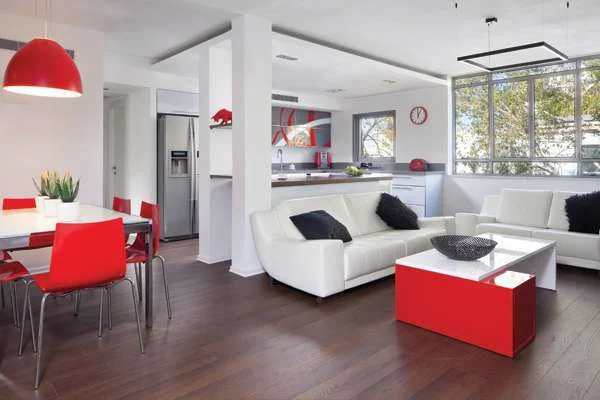 הפיכת חלל צפוף ומיושן למרחב מגורים המשדר פתיחות ומאה המטרים של שטחו מנוצלים היטב למגורי משפחה עם שני ילדים צעירים, היה האתגר שניצב בפני אדריכלית הפנים מיכל חן בתהליך השיפוץ שביצעה בדירה בהרצלייה. ברובד האסתטי, ביקשו בעליה לשוות לה אופי מודרני-אורבאני, ומראה פתוח וצעיר "עם כמה שיותר שילובי אדום" הצבע האהוב על בעלת הבית. הדירה כוללת גם גג ששטחו יועד ליצירת מרפסת ובניית סוויטה, אך בשלב הראשון התמקד השיפוץ בקומת הכניסה, שלדברי חן הייתה בלתי מנוצלת בעליל והקנתה תחושה דחוסה. "המטבח היה צר וסגור, "תחוב" בין דלת הכניסה וגרם המדרגות, והסלון נראה כחדר רגיל, ללא כל תחושת פתיחות. וכלל, העובדה שאין בדירה מרפסת ופתחי החלונות היו קטנים וסטנדרטיים רק הדגישה את דחיסותו של החלל" אומרת חן.