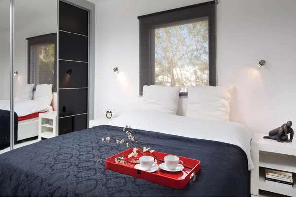 חדר שינה מעוצב: ניצול מיטבי שהצליח לשלב בשטחו גם חדר רחצה נוסף. אהבתה של בעלת הבית לצבע אדום היוותה גורם משמעותי בשפת העיצוב. חן: "אדום הוא אדום, צבע דרמטי בעל נוכחות חזקה מאד, ולכן שילובו במערך העיצובי היה צריך להיעשות במינון נכון ומבוקר. מחד, לתת לו מקום, ומאידך לוודא שלא ישתלט וייצר עומס ויזואלי.