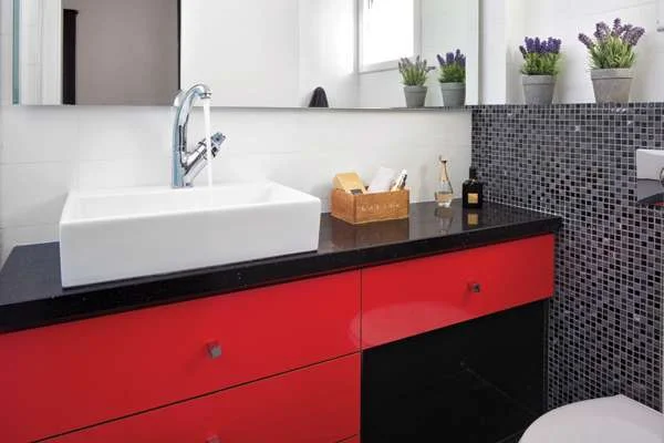 חדר רחצה מעוצב: האדום נעדר מחלל חדר השינה אך חוזר כשילוב דרמטי במיוחד עם גון שחור בחדר הרחצה החדש. מתוך מגזין בית ונוי 117: "הקו האדום"