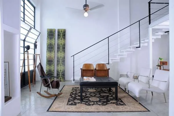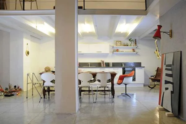 מבט מאזור הסלון אל אזור המטבח: פשטות חומרית וצורנית. עמוד תומך מסמן את חלוקת האזורים בחלל הפתוח, ומעל נראית גלריית השינה העליונה. גרם המדרגות המוביל אליה תוכנן כאלמנט מרחף המשלב ברזל ומדרכי עץ צבועים בלבן, ובמעקה הברזל המלווה אותו, כמו גם במעקה הגלריה, הותקנו כבלי מתכת, אשר בקיומם שכמעט ואינו מורגש משמרים את הפתיחות וממד אוורירי. התאורה בחלל היא תאורה ממוקדת שהותקנה במיקומים נדרשים ואופייה מגוון ומשתנה. כך, למשל, קורות התמיכה של הגלריה השוכנת מעל אזור המטבח גויסו לטובת הצנעה של גופים שקועים המאירים את שטחו, וביתרת החלל משובצים גופים דקורטיביים ייחודיים, דוגמת גופי תאורת במה גדולים המהווים חלק בלתי נפרד מהמארג הדקורטיבי-אמנותי שרוקם את אופיו האסתטי.