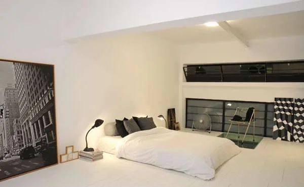 גלריית השינה המשקיפה אל החלל תחתיה: מעקה מעוצב כמסגרת ברזל עם כבלי מתכת, וריצוף בעץ צבוע לבן בו משתלב פתח זכוכית שקוף