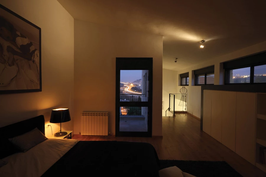 יחידת ההורים שבקומה העליונה - חלל משופע תקרה )כמתחייב בתב”ע של היישוב( הנפרש כ”אופן ספייס” מרוצף עץ, ומשלב בשטחו אמבט פתוח וריהוט בנוי המשתלב לאורך פתחים עליונים ומשמר חזות נקייה ואוורירית. ה”בונוס” של החדר: מרפסת קטנה ממנה ניתן להשקיף אל נוף הכביש העולה לירושלים.