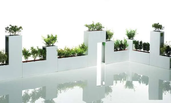 יחידות עציצים מאלומיניום לבן חוברות זו לזו בצורה מודולארית תוך יצירת משחק גבהים וצורניות גיאומטרית. עיצוב:Stefano Pirovan לחברת BySteelעיצוב ריהוט גינה - פינוק ללא פשרות