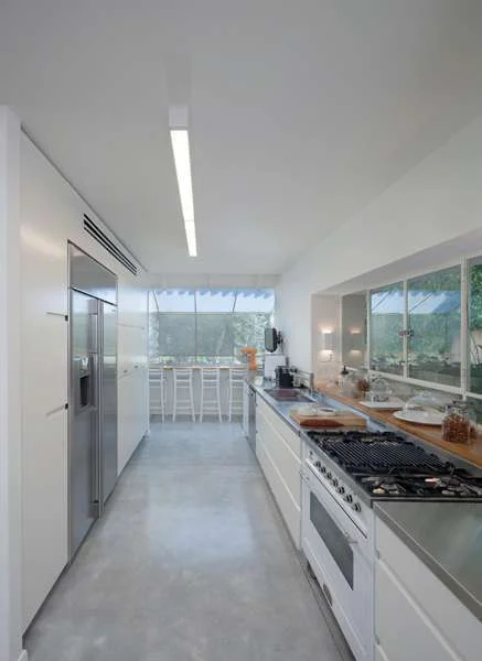 המטבח הממוקם כמו בניצב לפינת האוכל הינו חלל מאורך ובהיר, שחזותו העכשווית שזורה בהבלחות "רומנטיות" ושילובים חמימים למראה, כמו, למשל, תנור בעיצוב "ישן" המשתלב בינות יחידות לבנות בעיצוב נקי עם גימור צבע בתנור; משטח עבודה מנירוסטה בוהקת בו משתלב גם משטח עץ; אדן חלון פנימי ורחב המאכלס מיני כלים וצנצנות; או דלפק אכילה גבוה הממוקם בעומק שטחו בצמוד לקיר, מקורה בקירוי זכוכית חלבית משופע ותחום בזכוכית שקופה המעניקה למסבים אליו מבט ישיר לנופו של עץ זית. ככלל, הפתחים שהורחבו מדגישים בכל חללי הבית דיאלוג עם החוץ, אם באמצעות גישה ישירה מקומת הכניסה ומאחד המפלסים התחתונים, ואם באמצעות צמרות עצים ירוקות הנצפות מפתחי המפלסים הגבוהים.