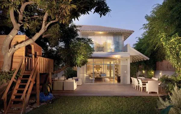 החזית האחורית. שקיפות הויטרינות מייצרת דיאלוג ישיר בין פנים לחוץ, ומרחב הגן נחלק לאזורי פעילות נוחים לכל בני הבית.מתוך מגזין בית ונוי 115: "דימיון ושכרו"
