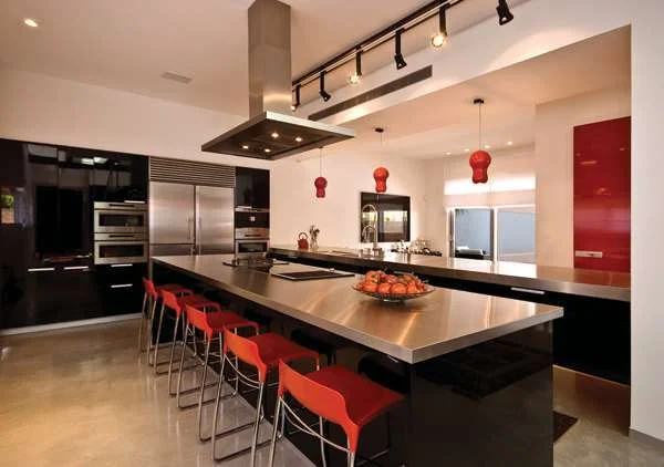 המטבח המרווח מגלם היטב את נוסחת הצבע של העיצוב הנשענת על גווני שחור, אדום ונירוסטה. כולל יחידת קיר גדולה בה משולבים מכשירי החשמל, ושתי יחידות אי.גונו האפור של חיפוי החוץ, כמו גם גונן האדום של מסגרות הפרגולות, שבים ומופיעים בשפת החומר והצבע של פנים החלל - שפה עכשווית, מודרנית ומדויקת, הנשלטת ע"י גווני שחור, אדום, אפור ונירוסטה המועדפים על בעלת הבית, שמלווים את כלל אזוריו תוך יצירת מסגרת קוהרנטית ורצף ויזואלי עם החוץ. ריצוף החלל נעשה בבטון מוחלק, ושימוש נוסף בבטון נראה בקיר פינת האוכל, שחופה בלוחות עשויים מהחומר שבוצעו בהזמנה והותקנו בהתקנה יבשה, כאשר אמצעי חיבורם לקיר מייצרים מראה מפתיע ורך המזכיר ריפוד קפיטונאז' משהו. שפת הצבעוניות מופיעה גם במטבח המעוצב בגימור שלייף לק שחור עם שילובי נירוסטה ואדום, בחזותו הדרמטית של חלל שירותי האורחים שקירותיו חופו בטיח שחור ודלתו האדומה משתלבת בחלל כקיר מחופה טפט; את הסקיילייט ברום התקרה חובקת תקרת מתיחה שחורה ומבריקה שבתוכה הותקנה תאורה שקועה, ואף אלמנטים מבניים דוגמת גרם המדרגות העשוי מתכת או הבמה הבנויה עליה ניצב האקווריום, מגלמים בצבעם השחור את הקפידה שמקנה לחלל עוצמה וחזות מהודקת. עוצמה זו נתמכת ע"י התאורה שהיוותה מרכיב רב חשיבות בתכנון, והורכבה מגופים שקועים וגופים דקורטיביים, אשר מעבר להיבטי הפונקציונאליות והפצת האור נוטלים חלק פעיל בהדגשת אלמנטים מבניים או הגדרת אזורים, דוגמת רצף של גופים שקועים שנקבעו בתחתית הקיר המלווה את מהלכה של שדרת המבואה, או גופים דקורטיביים תלויים שמגדירים את פינת האוכל ואף "קושרים" את שתי קומות החלל. הדובדבן בסצנת התאורה היא מערכת גופי לד שהותקנה מעל קיר הבטון, כשהיא "צובעת" אותו באורות משתנים אשר באופן נפילתם על הלוחות הלא מפולסים משווים לחומר הקשה ממד של רכות, ואף האקווריום המואר מתקבל כאלמנט תאורה מרהיב וייחודי, מלא ערך מוסף של פיסת טבע חיה במרכז החלל.