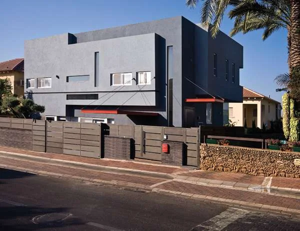 הבית, הממוקם על מגרש ששטחו 500 מ"ר, הינו חציו של דו משפחתי ומפגשו עם הבית השני תוכנן בממד הצר שלו, כך שהתחושה היא של בית בודד ללא כל זכר לקיומו של "החצי" הנוסף, ומבט לעבר חזיתו הקדמית מעורר סקרנות מידית כשרמיזות למתרחש בחלל הפנים נחשפות דרך חלון סרט (פתח אופקי) שנפער בה בגובה של כמטר מהקרקע. חזית זו היא רק בבחינת פרולוג לבית שמתארו מלבני-אורכי ומעטפתו מתגלה כקומפוזיציה מבנית בה משתלבים משחקי מישורים, מסות ושקיפויות תוך יצירת עניין צורני משתנה המודגש גם באמצעות חיפוי החוץ: המישורים ה"בולטים" מחופים בטיח אפור בהיר והשקועים בגון כהה. לעושר הצורני ולגוני האפור חובר גונן האדום של מסגרות עשויות ברזל של פרגולות תלויות המחוברות למבנה באמצעות כבלי מתיחה ומקרות את אזורי החניה, מבואת הכניסה החיצונית ורחבת ישיבה בחזית האחורית, ורק הגג השטוח ממתן משהו את המופע העשיר.