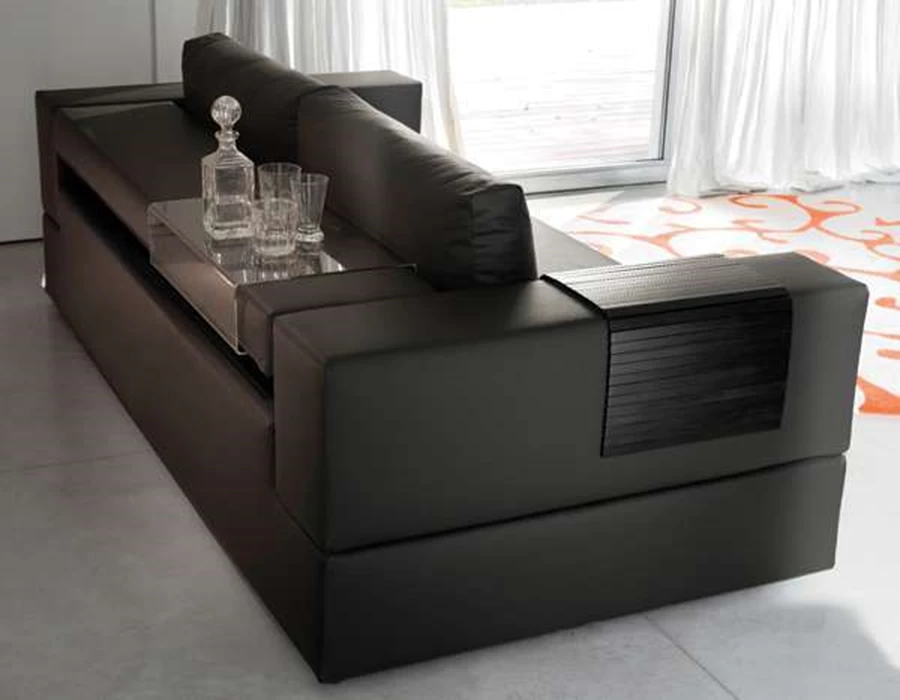 ספה שחלקה האחורי יכול להגיע במצב מקופל ובמצב פתוח לכלל מגש / משטח אירוח. מילאנו בדינג