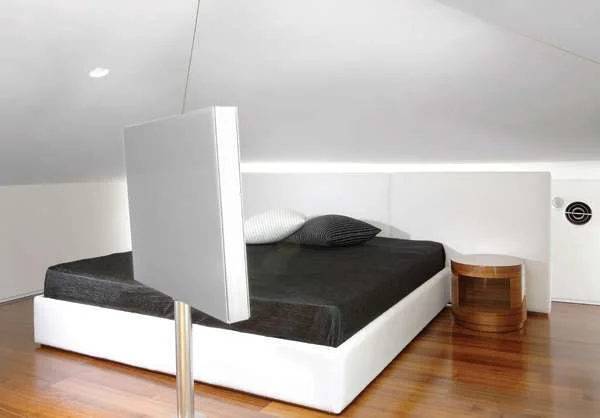יחידת השינה בגלריה העליונה: ריצוף עץ אגוז ועיצוב מינימליסטי המותאם לממדי החלל ומגלם את שפת הבית.