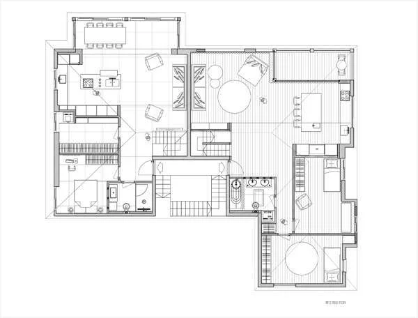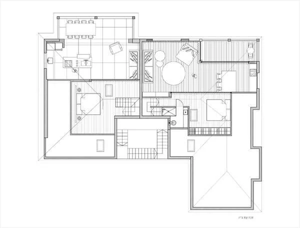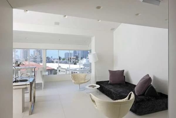 תאורת החלל מתקבלת מגופי גבס שקועים ללא כל גופים דקורטיביים כאלה או אחרים, ופריטי הריהוט ששולבו בו, מעטים אך מובחרים, משלימים את חזותו המינימליסטית-מדוגמת בה ניתן לזהות אייקונים מבתי היוצר של מעצבים מובילים. מעל הסלון "רוכב" פתחה השקוף של הגלריה העליונה המבהיר כי שפת העיצוב המצומצמת אינה פוסחת גם על יחידת השינה, אם כי כאן מזומנת "הפרה" של מארג הקרם: הסולם ששימש את אמית כדי להגיע אליה הומר בגרם מדרגות מרשים מאד עשוי עץ אגוז שטרייף בגימור מבריק, אשר בנוכחותו השונה כל כך מסביבתו הבהירה ובקווי עיצובו המוקפדים הופך לאלמנט פיסולי לכל דבר, ואף מסמן מעבר לחלל הפרטי העליון שרוצף בעץ זהה.