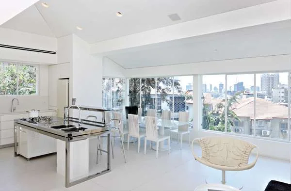 מבט מכיוון הכניסה אל עבר החלל, שסיפוח המרפסת החזיתית לשטחו העניק לו חזית שקופה ותמונה חוץ רחבה של נוף עירוני. "מודי","טולמנ'ס", "100+" יבגני.בגלגולה הנוכחי עוטה הדירה האוורירית גון קרם ששולט בכל האלמנטים ששולבו בה: ריצוף הגרניט הוחלף באריחי "אנדלס" גדולים בגון קרם ששימש גם לצביעת הקירות, ואף כל פריטי הנגרות מתהדרים בגון זהה המייצר שפת חלל מונוכרומטית ומוקפדת עד אחרון פרטיה, מינימליסטית ומודרנית מאד. הפונקציות הציבוריות חולקות מרחב משותף, שבחלקו הקדמי ממוקמת פינת הישיבה של הסלון, במרכזו ממוקם המטבח, ופינת האוכל בעומקו, סמוך לוויטרינה השקופה דרכה נחשף נוף הסביבה. יחידת האי של המטבח, המעוצבת כעין שולחן עשוי על טהרת הנירוסטה, מוקמה בקו אופקי במקביל לשולחן האוכל כך שגם העוסקים במלאכת הבישול יכולים להתבשם ממראה החוץ ומקשר עין ישיר עמו, וכל יחידותיו האחרות משלבות חזיתות בגון קרם וגימור מבריק עם דיגום טיפוגראפי המעיד על תוכן התכולה המאוחסנת בהן.