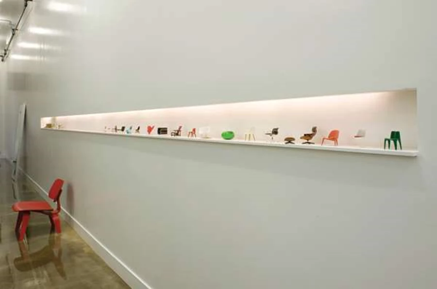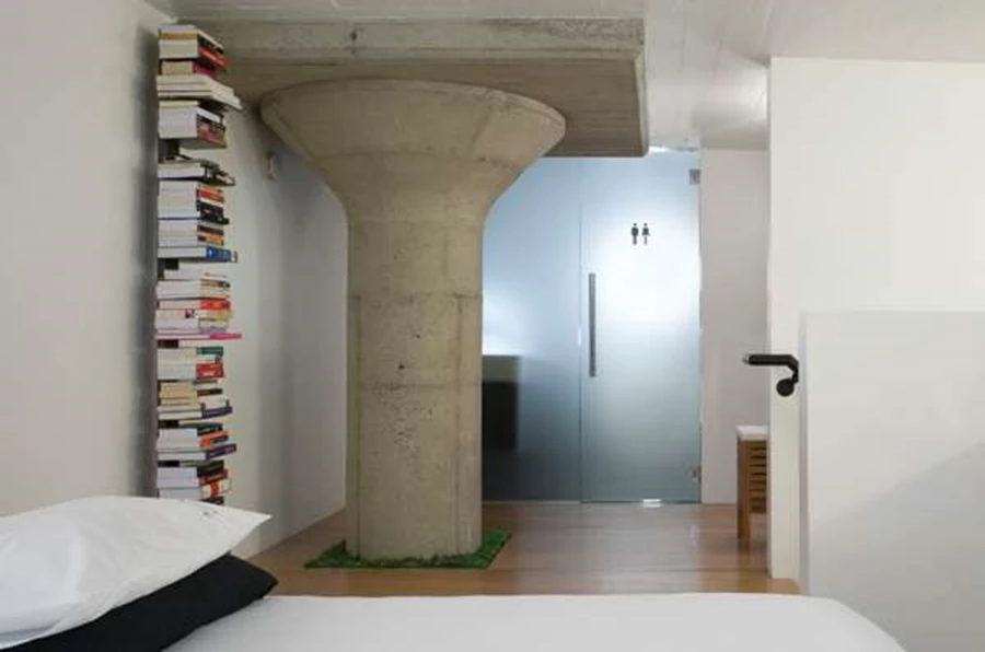 ואכן, במטבח המינימליסטי המעוצב על טהרת המתכת - חזיתות אלומיניום ומשטחי נירוסטה- מתנוסס ברקוד על מחיצת הזכוכית החוצצת בינו לבין החדר הצמוד, על דלתות חדר הרחצה/שירותים מופיעים דמויות גבר ואישה כמו האייקונים המסמנים חדרי שירותים בחללים ציבוריים, וחדר הרחצה, שעיצובו משלב חיפויי קיר מנירוסטה ואביזרים סניטאריים שחורים, מתנאה במחיצת זכוכית מעוטרת בסימן היסוד של מים. קריצה אחרת, לא גראפית במקרה זה, מגלמת "ערוגת דשא" ממנה צומח חלקו העליון של עמוד בטון קונסטרוקטיבי הפורץ את תקרת קומת הביניים, ועניין ויזואלי מלבב למראה מייצרת גם גומחה צרה שנפערה לרוחבו של קיר כשהיא מאכלסת בתוכה דגמי כיסאות מיניאטוריים. כמו המוטיבים הגראפיים, כך גם הגומחה מייצגת היטב את זיקתה של אקסלרוד לגיאומטריה נקייה ולקווים ליניאריים, ונראה שאף הבחירה ה"דקורטיבית" בדגמי כיסאות שעל עיצובם חתומות אושיות מעולם העיצוב והאדריכלות, דוגמת איימס, מיס ואן דה רוהה, פנטון, ריטולד ואחרים, אינה אקראית כלל ועיקר. שכן אקראיות אינה מושג שיכול להיכלל בעולם המושגים של שוחרת תמצות רעיוני כמו אקסלרוד, אשר אכן השכילה לזקק את איכויות החלל הישן ולהעניק להן פרשנות עכשווית, כה אסתטית וכה מדויקת.