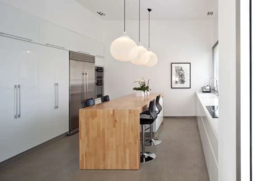 יחידת קיר גדולה, יחידת כיור ומשטח עבודה. בתווך יחידת אי גדולה המשמשת גם דלפק אכילה ומלווה בשלושה גופי תאורה בעיצוב כדורי.