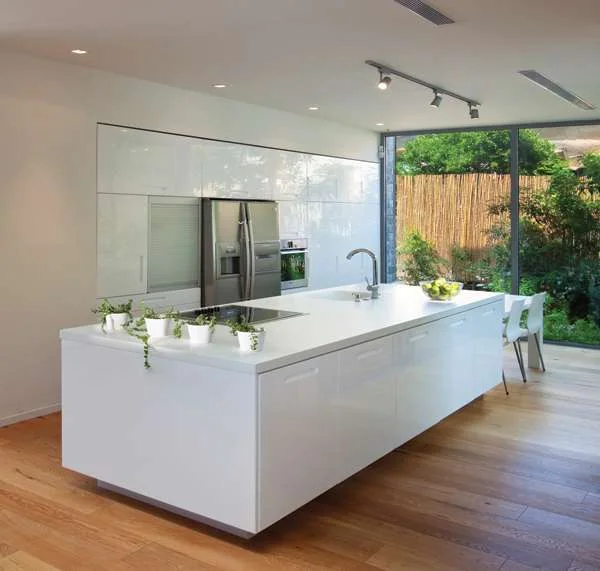 אזור המטבח: עטוף בקירות שקופים המחברים אותו בקשר ישיר עם רחבת הדק שממוקמת ביציאה ממנו. נגרות מטבח: נגריית ויקטור ביתן