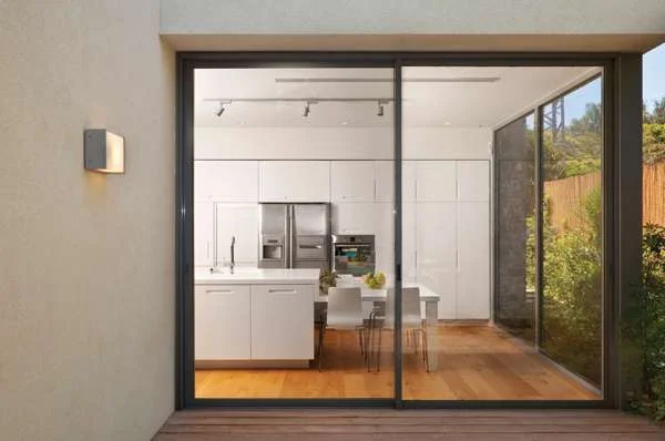 מבט מתוך רחבת הדק החיצונית אל תוך המטבח: שקיפות המחברת את שני האזורים. אזור הדק משמש כסוג של חדר חיצוני ובשטחו מוצבת פינת אוכל.בתוך חלל הפנים, המרוצף בפרקט אלון, מחדד הקיר המשותף עם הבית הצמוד את ציר האורך כשחיפויו הזהה לחיפוי החוץ אף מייצר תחושת המשכיות, והוא טופל באורח המשווה לו עניין ויזואלי: גרם המדרגות שעוצב כקונסטרוקציית מתכת ומדרכי עץ הותקן בצמוד אליו עם ליווי של תאורה שקועה; בתקרה הגבוהה מעליו שולב סקיילייט אורכי המחדיר אור יום רך; ובמפגשו עם הקומה העליונה תוכנן קיר זכוכית חלבית שכמו מנתק אותו ממסת הבית תוך יצירת ממד אוורירי.