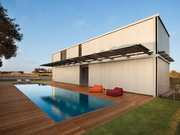 דק העץ החיצוני תוחם בריכת שחייה גדולה שתוכננה עם שפת גלישה ובגמר טיח כהה, כאשר מעבר להנאה הספורטיבית שהיא מעניקה, נוכחותה "בולעת" את קרני השמש ומצננת את משבי הרוח החולפים דרכה לכיוון הבית. אזורי הישיבה ששולבו בשטח הדק מקורים בפרגולה עשויה רשת פלדה המרככת משהו את ממד החשיפה של חללי הפנים, אך אינה מפרה את המהות של פנים וחוץ השזורים זה בזה בחוויית מגורים ייחודית ומיוחדת שנרקמת כל יום וכל שעה מחדש.