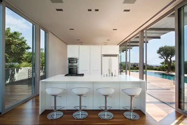 המטבח - כשהוא נתון בין חזיתות שקופות מקבל חלל הפנים משמעות של מרחב ביניים שדרכו ותחתיו נמהלים החוץ והפנים תוך יצירת חוויית מגורים דינמית ומשתנה.החומריות שנבחרה לשמש בבית הינה בסיסית וניטראלית, מותירה את מלוא הבמה לתכניו הרעיוניים של החלל שהחוץ הינו חלק בלתי נפרד מזהותו- עץ, בטון, זכוכית, והאלומיניום שמשמש לתפירת החליפה. ריצוף חלל הפנים, למשל, נעשה בלוחות עץ איפאה זהים לאלה המשמשים בדק החיצוני, כשהוא מגלם את "רצף הזהות" ומדגיש אותו.