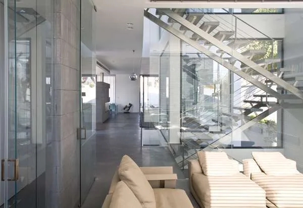 הכניסה לבית מבהירה באחת את רעיון הזרימה שעמד בבסיס התכנון, ומפגישה את הבאים עם חלל מבואה גבוה ממנו ניתן לקיים קשר עין ישיר עם קומת המרתף התחתונה ועם הקומה העליונה. מול חלל זה נחשף פיר אנכי שקוף המחבר את שלוש קומותיו כשהוא חובק פטיו פתוח במרכזו, וגרם מדרגות אוורירי, המשלב קונסטרוקציית נירוסטה ומדרכי אבן, מעצים את ממד הפתיחות והחיבור הוויזואלי ביניהן: קומת מרתף בה תוכננה סוויטה לבת המתגוררת בבית, קומת כניסה בה מרוכזות כל הפונקציות המשותפות, וקומה העליונה המכילה בשטחה את החללים הפרטיים של בני הזוג וכן חדר כושר וחדר שינה נוסף לאירוח.