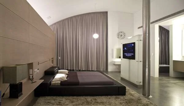 יחידת השינה שבקומה העליונה, הנחלקת אף היא לשני אגפים המצויים משני עברי הגשר. מימין נראה מבט מחדר הכושר אל חלל החדר, הנחלק לאזורים.