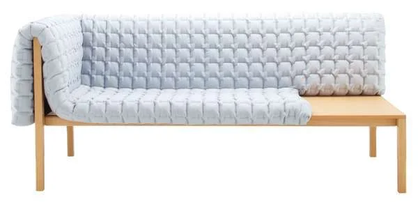 Ruche - ספת ספסל המשלבת קונסטרוקציית עץ מעודנת וריפוד במראה טלאים וסוג של תיפורי קפיטונז ללא כפתורים. עיצוב: אינגה סמפה .