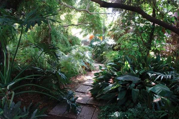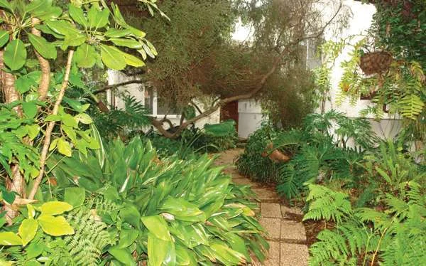 פסעתי אל החצר האחורית בסקרנות, אחרי שכבר מתוך הבית הבחנתי בעושר הצמחים ובגזעים פיסוליים. מתחת לרשת צל פרושה על גבי קשתות נוצרה פינה אינטימית ובה אוצר של חוויות: מיני צמחים ממשפחת ה-'ברומליים', מיני וזני 'בגוניות', זנים של 'בשמת הסולטאן' ו-'קורדילין אמירי אדום-שוליים' המוסיף גווני צהוב, ורוד,סגול, אדום וארגמן ויוצר כתמי צבע וצורות מעניינות. מסביב חובקת את הגן בחמימות מסגרת של שיחים וצמחים עשבוניים שצבעם ירוק, וביניהם מיני 'שפלרות', שרכים, 'פילודנדרונים' ו-'דרקוניות'. בין לבין נמשכות העיניים אל צורות מעניינות – עלים של 'קרן-אייל ענקית', "נוצות" שרך ה-'קירטומיון החרמשי' ופיתול גזעי ה-'מללוייקה המצומדת', כשכולם חוברים לאוצר של יופי ושלווה מעוטר באור ובפניני טל.