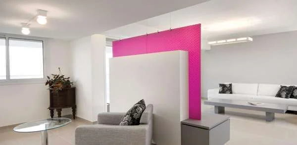 רהיט חוצץ בין חלל האירוח לפינת קריאה אינטימית, המורכב מיחידת אחסון נמוכה ולוח Benacore ורוד, לתוכו מוטמעת טלוויזיה.