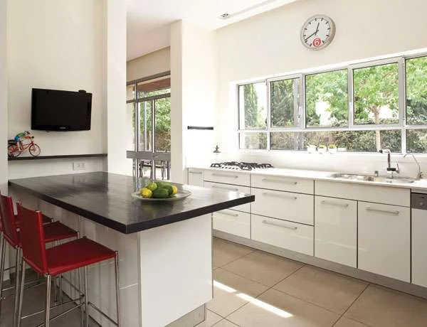 מטבח בעיצוב מודרניאדריכלות ותכנון הפנים כוללים גם את הקומה העליונה, שמשקיפה אל חללו הכפול של הפרק השקוף מבעד למעקה זכוכית. קומה זו תוכננה כמעבר רחב ונוח, שלאורכו מוקמו החדרים - שלושה חדרי ילדים החולקים חדר רחצה משותף, וסוויטת הורים הכוללת מרפסת הצופה אל החצר האחורית. חדרים/סוויטות שרוצפו בפרקט, וקומת המרתף ששטחה כולל חדר משחקים, חלל קולנוע ביתי ושטחי שירות.