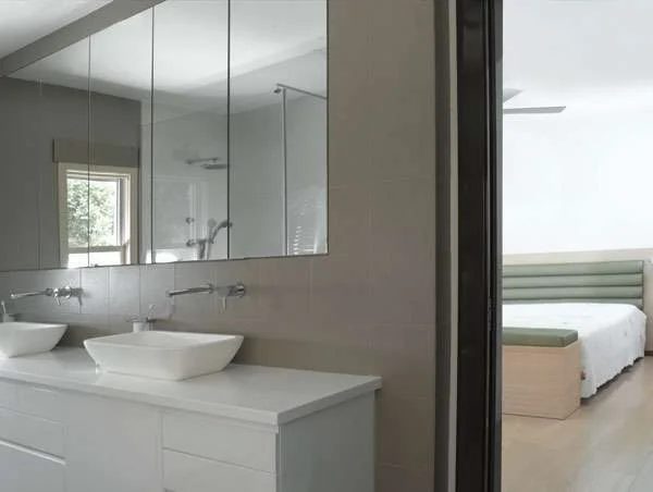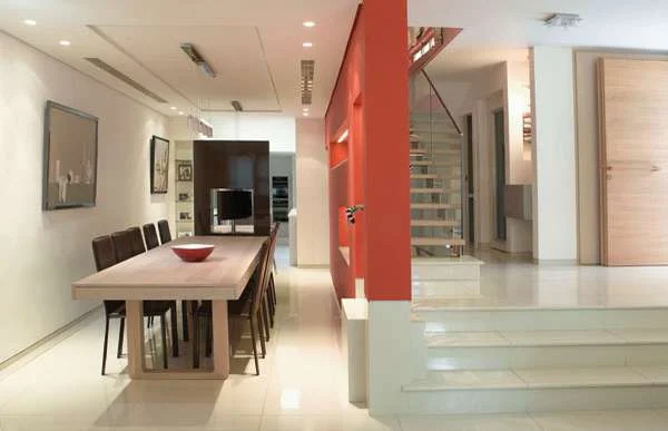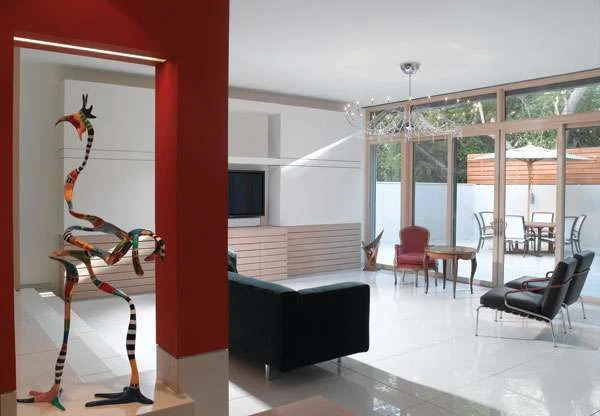 מבט אל חלל הסלון ואל רחבת הישיבה החיצונית: ריצוף באריחי גרניט פורצלן גדולים, קירות בגון לבן שבור ומרקם מבריק למחצה
