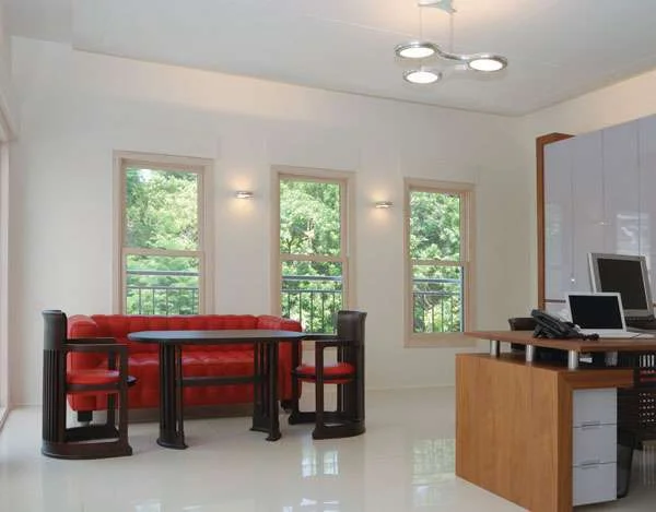 חדר העבודה שעל הגג: שטח מרווח הנהנה מפתיחות מבטים וממרפסת צמודה, ופריטי הריהוט בו מצטטים עיצוב אייקוני של פרנק לויד רייט.