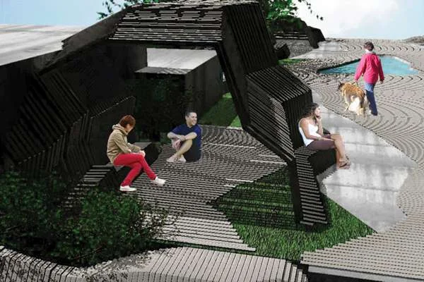 גן טופוגראפי שתוכנן באמצעות קורות עץ החתוכים באורך משתנה ומוצבים ברחבי גן באשדוד, בו מצויים ארבעה מקלטים ציבוריים. באמצעות קורות העץ מוגדרים בשטח מקומות למנוחה, מפגש ומשחק, המשתלבים בהרמוניה במבנה הגן ובצמחיה הטבעית שבו.