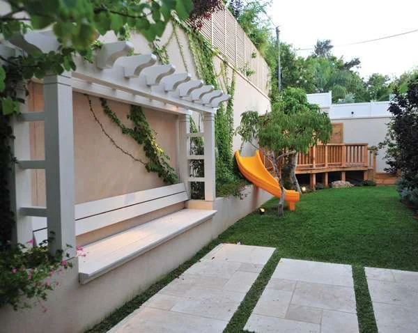 מעברים גדולים מהבית לגינה אחת הבקשות הראשונות של בעלי הבית, זוג צעיר עם ילדים קטנים, הייתה להקצות חלק מהגן לשימוש הילדים וליצור עבורם אזור משחקים. לאחר חשיבה על כך וסיור בגנים שונים בהם משולב "אזור ילדים", אותר המקום המתאים לשילוב הפונקציה בחלק האחורי של המגרש - חלק שלכאורה נראה בעייתי משום הפרש הגבהים הגדול יחסית בין המגרש למגרש השכן שמעליו. על מנת למתן את ממד הגובה ולטשטשו נאלצנו ליצור טרסת בטון לכל רוחב המגרש, דבר שהצר אמנם את שטחה האחורי של הגינה האחורי, אך נוצל כך שהטרסה הצרה משמשת ליצירת מעבר בין הבית לפינת המשחקים.