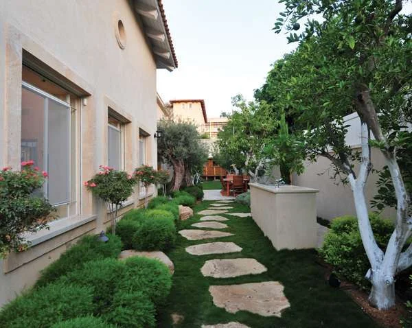 אבני מדרך מובילות מהכניסה לחצר האחוריתלאחר דיונים רבים בין כל הנפשות הפועלות (האדריכלים, בני הבית וכותב שורות אלה) אודות כמות המשטחים המרוצפים הדרושה לבני הבית הוחלט, לשמחתי, לוותר על משטח מרוצף נוסף באזור הסלון, לבטל את היציאות החוצה ולהמירן בחלונות גדולים, ולאפשר לשביל הכורכר ולצמחייה שסביבו לעטוף את חלל הסלון בתחושה ירוקה. את פינת הברבקיו החלטנו למקם במעלה השביל, כך שהיא מתקבלת כפינה עצמאית ממש בתוך הירוק, מעניקה שירות לפינת האוכל הניצבת לצידה ובמקביל שומרת על קשר עין עם חלל הפנים.