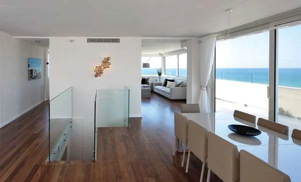 מיקומה הגבוה בבניין משותף בעל תשע קומות ששופץ לאחרונה, אמנם חשף את דירת הגג הדו קומתית לנוף ים מרשים המשתרע מולה, אך עד לאחרונה קשה היה ליהנות ממנו - חללה הסגור היה מוקף חלונות כהים עם מסגרות מרובות שחסמו את יפי הסביבה, וחיפויי עץ בתקרה ובקירות הקנו לה מראה חשוך ודחוס. "כדירה שהינה דירת נופש של תושבי חוץ, ברור שהרעיון המרכזי היה בראש ובראשונה לפתוח אותה אל הנוף, וכן לנצל את שטחה באורח פונקציונאלי ונכון לזמני חופש, נופש ואירוח" אומרת מעצבת הפנים אתי ונדרמולן, אשר בשיתוף עם בעלה גרי, בעל חברת בנייה, ביצעו בה שיפוץ מקיף שכמוהו כבנייה חדשה מבראשית.