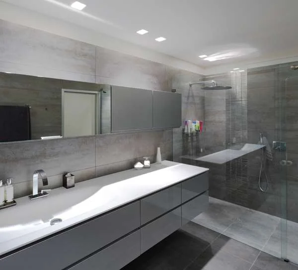 חדר רחצהבמפלס הכניסה שמה חלוקת החלל דגש על ניצול מקסימאלי של שטח, יצירת זרימה נוחה בין הפונקציות השונות, וכמובן על חשיפה מרבית לנוף הים. פינת האוכל מוקמה מול מערך הויטרינות, כך שכל ארוחה מתובלת בנוף הים, ובמידת הצורך, כמו, למשל, בעת ארוחה רבת משתתפים, ניתן "לגלוש" לשטח המרפסת. אזורי המטבח והסלון הופרדו זה מזה באמצעות יחידה בנויה, אשר אופן הצבתה מותיר פתחי מעבר ביניהם משני צדדיה, כמו גם קשרי עין המשווים תחושת פתיחות. וויתור על חדר שירות שהיה צמוד למטבח הגדיל את שטחו ובחללו אף נפער פתח חלון החובר למערך החלונות שמקיף את הדירה, כאשר דלפק בר שהותקן תחתיו מזמין לשתות את הקפה של הבוקר מול הים. במרכז מתארו המלבני הוצבה יחידת אי, בשטח שנוסף לו עם הוויתור על חדר השירות שולבה יחידת ארון כרצף של יחידות האחסון, ואף מכונת הכביסה והמייבש הוצנעו בתוך ארון בעל חזיתות זהות, שמתקבל כחלק בלתי נפרד מהמטבח.