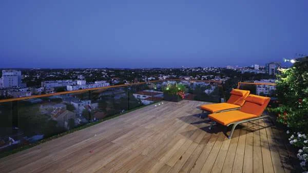 מרפסת שיזוף שנוספת לדירה תוך ניצול שטח הגג. ריצוף דק אירוקו שהוקף בחיפוי דשא, קיר עץ עליו מטפסת צמחייה , כורסאות שיזוף, ומעקה שקוף. ניצול מיטבי של מיקום הדירה מול רצועת החוף, בא לידי ביטוי במרפסת הסובבת אותה, אשר חלק ממנה הוגבה ותוכנן כמשטח דק (עץ אירוקו) המאפשר ליושבים בשטחו ליהנות ממראה הים. המרפסת הנעימה, מסתבר, לא היוותה עבור ונדרמולן סוף פסוק- גרם מדרגות חיצוני שמוביל ממנה מתברר כמוליך אל תוספת חדשה, אשר ניצלה את גג הקומה העליונה ליצירת מרפסת נוספת. גם מרפסת זו חופתה במשטח דק ששני צדדיו חופו בדשא, ובשטחה נבנה גם קיר עץ שעליו מטפסת צמחייה בעלת פריחה צבעונית, המשתלבת עם כורסאות השיזוף הצבעוניות לכדי מראה קיצי ומלבב. מרפסת השיזוף הוקפה במעקה זכוכית החושף את הנוף במלואו, וכל הווייתה אומרת נקודת תצפית המשקיפה מגג העולם על כל המרחב הפרוש תחתיה, עד קו האופק.
