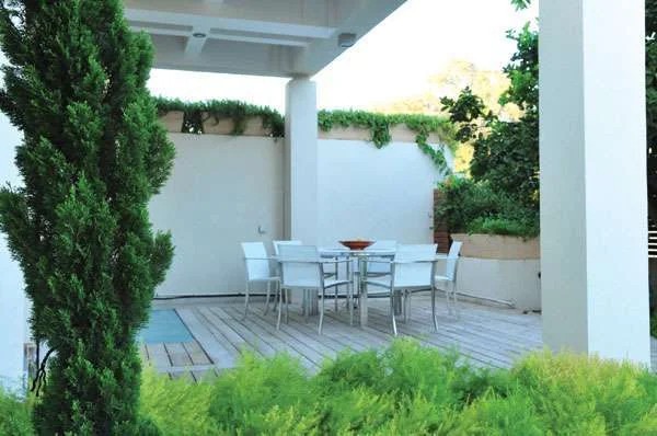 פינת ארוחת בוקר בגינה האסוציאציות שהם העלו בהקשר לכך היו שקט, רכות, מרגוע וניקיון. כבר בשלב זה, שקונספט העיצובי היה עדיין רחוק מלהיות מוגדר, היה ברור שהגן צריך להיבנות בקווים ישרים ונקיים, עם משטחים רחבים שמאפשרים מעבר חופשי ובמגוון מצומצם של צבעים כדי למזער את "הרעש" שמביטים על הגן. הגדרנו יחד את הצבעים שעולים בראש כשחושבים על חופש- ירוק, כחול, אפור, לבן, וכן את היעוד של כל צבע: הירוק זו הצמחייה, הכחול נועד לבריכת השחייה ולקיר שמאחוריה, האפור לריצוף והלבן לבדים הלבנים שנבחרו לשמש לקירוי במידת הצורך ולצבעה הפנימי של החומה המקיפה את הגן, שמהווה מעין מסגרת פספרטו למגרש כולו.לאחר מכן הגדרנו את המושג "פורמאלי" מבחינה עיצובית, תוך בירור עד כמה אנו רוצים להרחיק עם סגנון העיצוב הזה. האם כל הגן יהיה מסופר וגזום והעצים ניצבים כחיילים במסדר, או שמא ניתן להסתפק באזכור הפורמאליות ו"לשחרר" מעט את האווירה בגן. בעניין זה, לשמחתי, החלטנו יחד ליצור שתי שכבות בצמחייה: צמחייה שיחים תחתונה שתישתל בצפיפות ותיגזם על פי הסגנון הפורמאלי, ואילו העצים שיצאו מתוכה יהיו פחות "מסודרים"- בעלי צורה פחות או יותר אחידה, אך בהחלט לא גזומה וקצוצה על פי תבנית. באזור הבריכה החלטנו לעזוב את הקו הפורמאלי ולשתול דקלי תמר במטרה ליצור אווירה נינוחה יותר המזכירה בתי מלון.