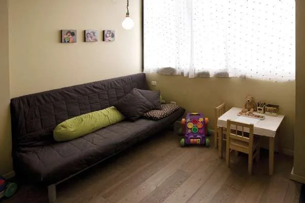 חדר משפחה במיקומה הפינתי נהנית פינת האוכל מפתחים העוטפים אותה וחושפים עצים ירוקים, ולחלופין מנוף אורבאני של בתי הרחוב - תלוי עד איזה גובה "מורידים" את הוילון הרומי שמעטר את כל חזיתו של החלל הציבורי. יחידת האי, שמשמשת כאלמנט מפריד בין המטבח ואזור הסלון, תוכננה כך שצדה הפונה למטבח מכיל פונקציות אחסון ועבודה, וצדה הפונה לסלון הינו בעל שפה גבוהה המצניעה את החלק המטבחי ומשווה לו מראה של בר. בנוסף, מקצה היחידה כמו צומחת יחידה נמוכה שבצד הסלון משמשת לאכלוס מערכת שמע ועל משטחה העליון ניתן להניח חפצי נוי. מעבר לפינת ישיבה נינוחה שמעליה תלויה תמונה בודדת, חף החלל מפריטי ריהוט או נוי אחרים, ואת מרקמו הרגוע שוברות רק "זריקות" של גון כתום, דוגמת רצועה כתומה בחזיתו האפורה של הארון, גונו הכתום של גוף התאורה בפינת האוכל, ואי אילו אביזרים כתומים במטבח. האגף הפרטי מאופיין באותה שפה תמציתית וחמימה כאחת, וההחלטה על שיכון הילדים בחדר אחד לטובת זכייה בחדר משפחה נעים מוכיחה את עצמה כנכונה ומבטיחה נוחות מגורים.