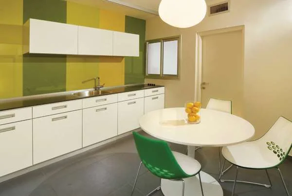 המטבח השוכן מעברו השני של גרם המדרגות. חלל סגור בעיצוב פרקטי ונקי, משולב עם הפתעה צבעונית בתוך כך, בחלוקת החלל החדשה נותר גם המטבח הסגור במיקומו המקורי, הסלון ופינת האוכל נקבעו במרחב אחד, שטחם של שני חדרים אוחד לכדי סוויטת שינה מרווחת, וחדר נוסף נקבע כחדר עבודה לבעלת הבית שמרבית עבודתה מתבצעת מהבית. כפרויקט שביצועו נצמד לתקציב מוגדר, החומרים שנבחרו ליצירת מסגרת החלל הינם איכותיים, כאלה שתורמים לחזותו העכשווית, אך לא יקרים מידי: הקומה הראשונה רוצפה באריחי גרניט פורצלן אפורים שהונחו בהדבקה, והקומה העליונה בפרקט. קירות החלל נצבעו בגון בהיר כדי לשמר את אווריריותו, וכבר בתחילת השיפוץ הוחלט על גופי התאורה שישולבו בחללים השונים - מרביתם דקורטיביים "לגופי תאורה ישנה חשיבות עצומה בחזותו הסופית של החלל, וההחלטה עליהם כבר בתחילת התהליך מבטיחה שהוא לא יגיע לסיומו בלעדיהם, כפי שקורה לא פעם" מדגישה שיף, אשר לתוך מסגרתו הסולידית - מינימליסטית של החלל יצקה עניין באמצעות שילובי אלמנטים מקוריים ונגיעות צבעוניות. הבולט מכולם בא לידי ביטוי בגרם המדרגות, שמאילוץ מבני הפך למוקד מקורי ויוצא דופן: מדרכיו צופו בעץ זהה לזה המשמש בקומה העליונה על מנת ליצור המשכיות, וה"מעקה" שצוות אליו הינו בלתי שגרתי בעליל - רשת עשויה כבלי נירוסטה. הרשת הותקנה כשהיא מתוחה בין שני מוטות מתכת המעוגנים לרצפה ולתקרה, ובתוך כך מייצרת סוג של מחיצה מחוררת החושפת את גרם המדרגות במלואו ומאפשרת מבט ישיר אליו וממנו. רשת זהה שולבה גם בקומה העליונה, במקום קיר חלקי שהוסר, והיא משווה לחללה פתיחות, כמו גם רצף וקשר ויזואלי עם הקומה הראשונה. "סטייה" אחרת משפתו המינורית של החלל שולבה במטבח, שעיצובו המינימליסטי נשלט ע"י גון לבן המופיע הן ביחידות האחסון והן בפינת האוכל העגולה שהוצבה בשטחו. את המרקם הלבן שובר טפט בגווני ירוק וצהוב עזים שמחפה את הקיר מעל משטח העבודה, כאשר מעבר להפתעה הצבעונית תצורת הדיגום כפסים אנכיים רחבים מעניקה אשליית גובה לחלל.