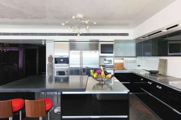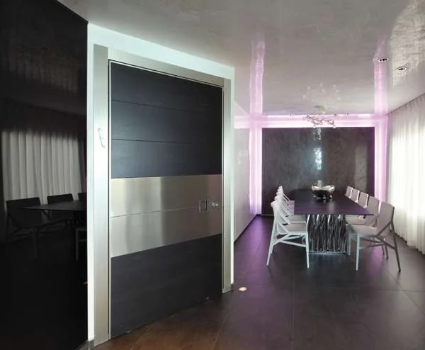 המטבח בחלל הציבורי: מעוצב בתצורת האות ר שחובקת יחידת אי גדולה ומשלב עץ שחור וחזיתות זכוכית כהה. מטבח: בופי. משמאל למבואת הכניסה, שהעמדתה האלכסונית מזמינה להתקדם פנימה אל תוך החלל, ממוקמת פינת אוכל שהינה, למעשה, חדר אוכל - חלל מוגדר כחדר לכל דבר, רק ללא דלת הסוגרת על פתחו "פינת אוכל מרווחת שתוכל להכיל בנוחות את המשפחה המורחבת הייתה סעיף חשוב בפרוגראמה, והוא שהוביל להחלטה להעצים את מהות הפונקציה ע"י יצירת אזור שהינו מופרד מעט משאר אזורי הקומה ולכן אינטימי יותר" אומר גרסטנר. במרכז חללו האנין ניצב שולחן גדול בעל מעמד פיסולי מרשים והכיסאות הלבנים שהותאמו לו מפתיעים ב"סטייתם" מפלטת הצבעים המדויקת, אך סטייה זו מתבררת כמחושבת ליצירת איזון נעים לעין בין מוטיב אופקי ואנכי - בקונפיגורציה האנכית שלהם ובגונם הלבן חוברים הכיסאות ויזואלית לקו קירות הסטוקו הלבנים, ומשטחו השחור של שולחן האוכל הגדול מייצר את הקו האופקי. אחת מפינות החלל תוכננה כגומחה להצבת יצירת אמנות ובעומקו נוצל עוביו של הקיר ליצירת אלמנט מעניין: בפעולות של גריעה וסיתות התקבלה בהיקפו מעין מסגרת שקועה ויתר שטחו נצבע בסטוקו אפור. בתוך כך התקבל הפרש מישורים המשווה לשטח הצבוע אפקט תלת ממדי, ובמרווח המסגרת התוחמת אותו הותקנו גופי לד המאפשרים "לצבוע" אותה בכל גון אור רצוי. תאורת החלל ככלל, תוכננה בתשומת לב רבה כמערכת שנועדה ליצור אפקטים ושטיפות אור ממוקדות להארת פריטי אמנות או ריהוט, ומה שנראה כפיזור אקראי של גופים שקועים בתקרה מתברר כתוצר של חישוב מדויק שנעשה לצורך זה. בנוסף, בתוך קרניז המשמש לתליית וילונות ומקיף את מרבית החלל, הוצנעו גופי לד צבעוניים, אשר כמו בפינת האוכל ניתן לבחור את גון אורם בהתאם למצב הרוח או האווירה הרצויה- דרמטי או רך, חושני או מעודן. את תרחישי האור של העיצוב משלימים שלושה גופי תאורה זהים, שהינם הגופים הדקורטיביים היחידים ששובצו בעיצוב - גופים פיסוליים איקונים של המעצב אינגו מאורר, שנתלו מעל יחידת האי במטבח, בתקרת פינת האוכל ובתקרת גרם המדרגות.