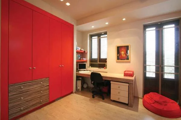 פינת עבודה בעיצובה של פנינה אמור. הפינה עשויה מעץ זברנו ומשלבת גם יחידה ניידת בצבע לבן, עם מדפים בנגיעות של אדום. רשת מטבחי רגבה