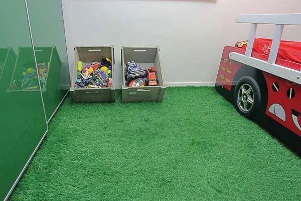 חדרו מרוצף הדשא של הבן. חלל צבעוני ועליז, שבהתאמה עוצב בגווני ירוק עם שילוב אדום עז ששוזרת בחללו המיטה המעוצבת כמכונית כיבוי אש.רעיונותיו המקוריים של לאור משובצים בכל רחבי החלל, אם בעיצוב יוצא דופן של פריטים, דוגמת ספריה שמדפיה מותקנים בשיפוע, ואם בשילוב אלמנטים מפתיעים, דוגמת משקל אדם ששוקע בתוך ריצוף חדר הרחצה, ומכריח את משתמשיו להתעמת עם האמת כל אימת שהם נכנסים לחללו (או לעקוף אותו). ההפתעות של לאור משתלבות עם אוסף פריטי וינטאג' של פזית ואיתי, שכמוהן שזור בעיצוב ומקנה לו את חנו המיוחד: מאוורר ישן, טלפון חוגה, מתקן לכסף קטן מהסוג ששימש את נהגי האוטובוסים ועוד. כך, למעשה, בתוך "תחפושת" של דירה פונקציונאלית, עכשווית ומוקפדת, משתלבים תכני הומור וטעם של פעם, כשהם חוברים למרחב אישי, חינני ומלבב, המשרת את דייריו בכל מובן- רגשי ופונקציונאלי.