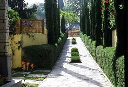 גם במעברי הגן, או בחללים אותם אנו מגדירים כ"פרוזדורים" המשמשים למעבר בין החדרים החיצוניים השונים שבשטחו, ניתן להעצים את תחושת המרחב על ידי שימוש בצמחייה נכונה היוצרת קירות גבוהים שתפקידם למשוך את עין הצופה בהם כלפי מעלה, ובכך ליצור תחושה של מרחב גדול יותר. בתמונה ניתן לראות שביל כניסה צר המוביל למגרש פנימי. המעבר הצר, שרוחבו 3 מטרים ואורכו כ-30 מטרים מיועד הן להולכי רגל והן למכוניות, וכדי להעצים את תחושת המרחב לעובר בו, כמו גם בכדי לטשטש את שטחו הצר, נשתלו ברושים ארוכים וצרים מסוג טוטם לאורכו של השביל, כשהם "מושכים" את המבט מהחלל התחתון הצר כלפי מעלה לשמיים. במצב זה התמונה הכללית המתקבלת היא רחבה יותר, ותחושת המרחב במבט מן הצד ובמעבר עצמו – מתעצמת.