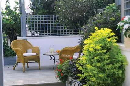 רהוט גן- פינת ישיבה על הגג פינת אוכל על מרפסת גבוהה בתל מונד. מאחר והבית גבוה מהגן והנוף פתוח ולא מוסתר על ידי הבתים השכנים, נשתלו עצים נמוכים בחלק שמתחת למרפסת, כדי לאפשר למבט להמשיך הלאה אל הנוף שמעבר לגבולות הגן. הנוף הנצפה מהמרפסת מעניק תחושה שמדובר בנחלה בלב השרון או הגליל ולא בבית עם מגרש ששטחו חצי דונם בלבד.