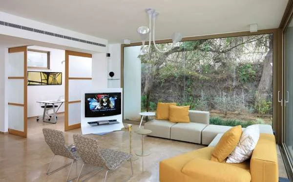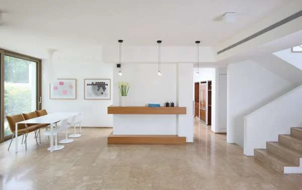 בחלל הציבורי - מבט אל עבר פינת האוכל והיחידה הבנויה שחוצצת בינו ובין המטבח, תוך הותרת פתחי גישה ישירים אליו משני צדדיה.תאורת החלל כוללת גופים מעודנים קבועי תקרה לצד גופים דקורטיביים שהותאמו לאופיו ועיצובו של כל אזור ואזור "כסוג של תכשיט" לדברי בעלת הבית, וסגנון הריהוט המינימליסטי מגלם אמירה מודרנית אנינה- פריטים מסוגננים שנרכשו בקפידה "אחד לאחד" והתאמות המעידות על טעם אישי מגובש ובהחלט לא שגרתי. כך, לדוגמה, כיסאות פינת האוכל ששלושה מהם עשויים חומר פלסטי לבן ושלושה אחרים מתכת וריפוד בגון חום-זהוב, או פינת הישיבה, המרנינה בגווני בז'-חקי וחרדל, שאינה עונה על המקובלות ואינה כוללת, למשל, שולחן קפה "תקני". ככלל, הצמצום החומרי והעיצוב המינימליסטי, ובתוך כך שילוב מדוד ביותר של פריטי נוי, מותירים מרחב אוורירי ראוי לנוכחות החוץ, שמשלימה את חזותו השלווה בערך הרמוני שאף פריט, מעוצב ככל שיהיה, לא יוכל לו. המטבח, טריטוריה אהובה על בעלי הבית חובבי הקולינריה המשובחת, הוא חלל פונקציונאלי ונוח, המצויד היטב בכל הנדרש לכך, ועיצובו משלב יחידות לבנות בגימור צבע בתנור ויחידות עשויות עץ אגוז אמריקאי בדיגום "שטרייף" שנבחר בשל גוונו הבהיר יחסית, שמכונה על ידי בעליו "בלונדיני". במרכז החלל ניצבת יחידת אי גדולה מאובזרת כראוי במיני פטנטים מתוחכמים, ובהיקפו יחידות אחסון שונות שתוכננו בתפירה אישית מוקפדת. סוג של "טוויסט" במארג המהוקצע, מגלמת פינת ישיבה חיננית, אידיאלית להפסקת קפה נינוחה, שניצבת ברחבת דק ביציאה מהמטבח ומפתיעה בגונה הורוד עז ובקווי עיצובה הרומנטיים.